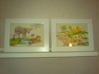 Dessa bilder är från en gammal bok som jag hade när jag var liten. Nu är det utsliten, men bilderna är söta. Och efter lite prat med Tant Grön (tack för tipset) så är de nu inramade. Väldigt gulligt, nästan lite för gulligt... De får hänga över Lilla H:s säng ett tag.